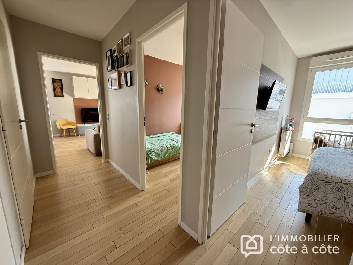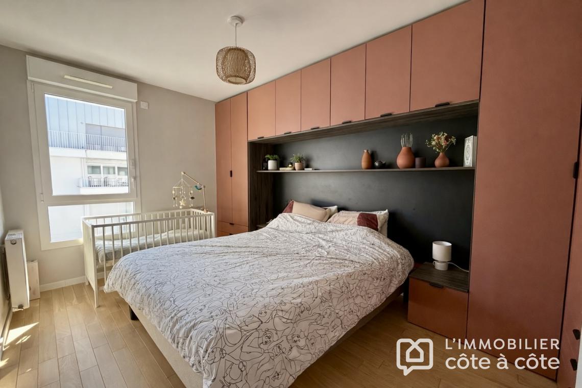 Dès l’entrée, vous découvrirez un agencement optimisé comprenant une salle de bains contemporaine, des toilettes séparées ainsi que deux chambres lumineuses. L’une bénéficie d’un accès direct au balcon, tandis que la suite parentale se distingue par son dressing sur mesure.