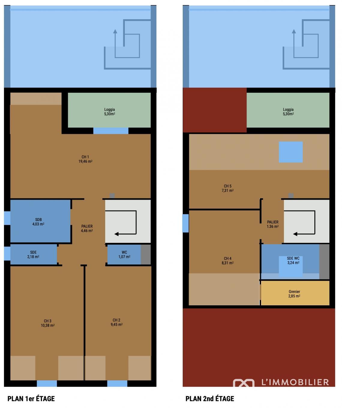 Au premier étage, le palier distribue trois chambres avec rangements dont une avec balcon, deux pièces d’eau éclairées naturellement et des wc séparés.